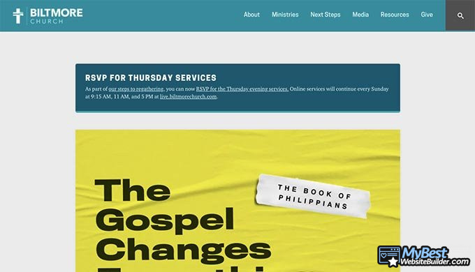 Церковь Biltmore обладает одним из самых простых церковых сайтов в нашем списке. Это один из самых простых примеров того, как вы можете создать очень простой церковный сайт, без причудливых всплывающих окон и других хитростей интерфейса.