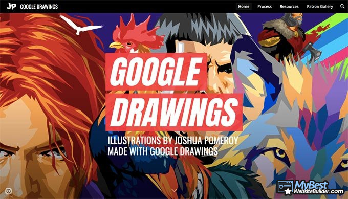 Google Drawings демонстрирует, что вы можете делать с сервисом GS с визуальной точки зрения. Это сайт в виде портфолио и имеет как работы, так и описание процесса работы художника, с визуальным сопровождением.