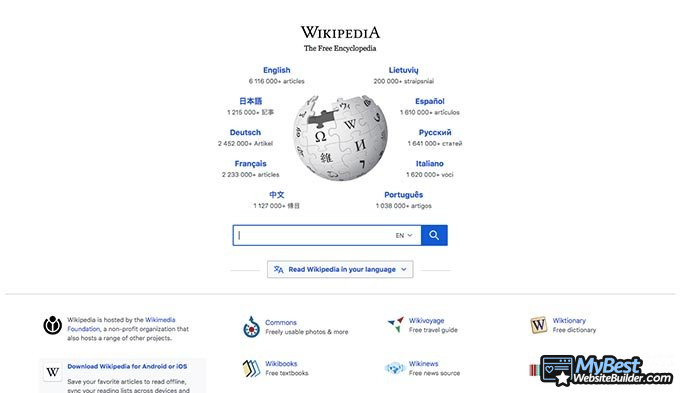 Так как Wikipedia в основном используется для поиска какой-либо информации, то поисковое поле находится прямо в центре страницы. Сайт также использует стерильный, простой и приветливый дизайн.