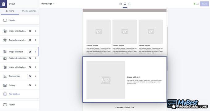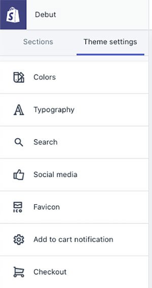 После выбора шаблона, нажмите "Настроить" и вас отправят в редактор Shopify. В левой стороне вы можете увидеть настраиваемые разделы, которые вы можете редактировать один за одним.
