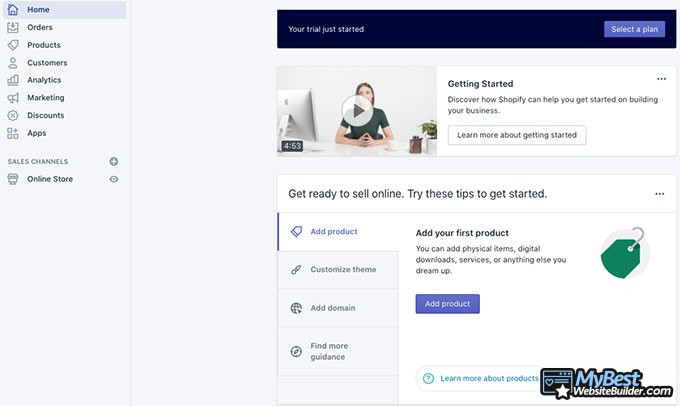 Перед собой вы увидите панель администратора Shopify. В левой части вы сможете найти навигационное меню, а в середине, советы для помощи новичкам в работе с редактором. Shopify разделяет весь процесс на три основных шага: "Добавление товара", "Настройка шаблона" и "Добавление домена". Даже если вы не знаете ничего про Shopify, как продавать на нём и что это вообще, у вас всё равно получится разобраться во всём этом.