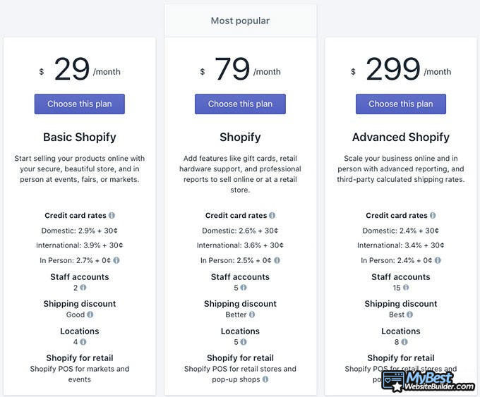 После интегрирования приложений, настанет время покупки тарифного плана. Shopify предлагает вам три различных тарифных плана: