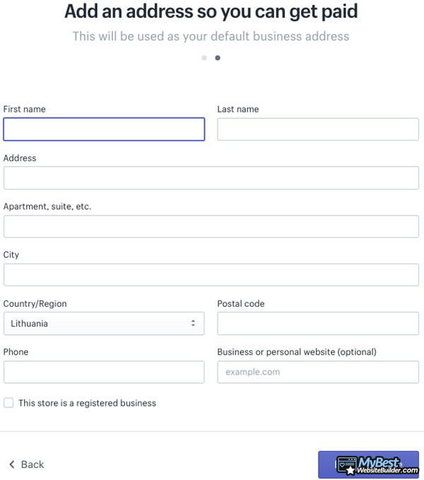 Затем, вам нужно будет заполнить некоторую личную информацию, включая ваше имя, адрес, квартиру, страну, почтовый код и так далее. Предоставление подобной информации необходимо для успешной регистрации в Shopify.