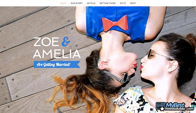 Сайт Зои и Амелия показывает весёлый вариант свадебного сайта. Платформа вовсе не блещет функционалом, но всё равно выглядит как хороший пример, особенно если вас интересует простой свадебный сайт.