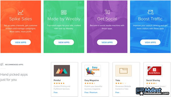 Вы можете найти приложения, отобранные специально для вас и выбрать из предоставленного списка или найти приложения, которые разделены на различные категории, вроде электронной коммерции, общения, маркетинга, социальных, для сайта, инструменты и функции. Важно упомянуть, что с бесплатным Weebly создать сайт с некоторыми приложениями не получится, они доступны только лишь для платных пользователей.