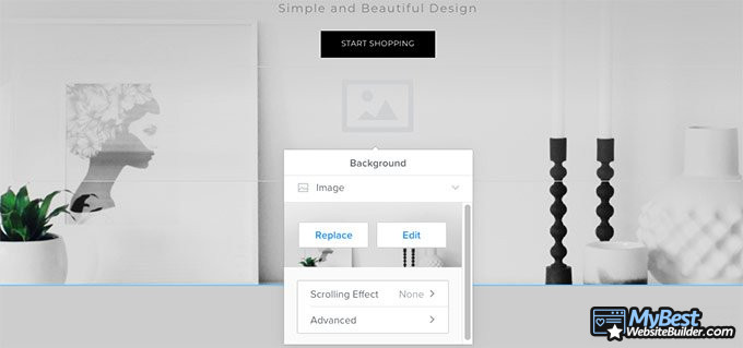 Для редактирования сайта вы можете начать с изменения заднего фона. Вам нужно лишь нажать на задний фон и сделать необходимые изменения: добавить или редактировать изображение, выбрать эффект прокрутки и воспользоваться более продвинутыми функциями, которые позволят вам применить изменения на другие страницы, а также выровнять контент по вашему желанию.