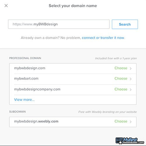 Теперь, если у вас уже есть доменное имя, то вы можете выбрать между его подключением или переносом. В том случае, если его нет, то просто выберите из списка доступных доменных имён, что предлагает вам Weebly.